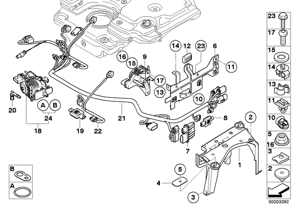 Запчасти из Германии / Запчасти БМВ / Запчасти E90N / 335d / Группы запчастей / Группа 16 «Система подачи топлива» / SCR насос/фильтр/доп.элем. SCR насос/фильтр/доп.элем. для БМВ E90N, модель 335d № Наименование Дополнение Кол-во Вып. с Вып. до Номер AE 01 Кронштейн 1 16136768644 02 Упорный буфер педали сцепления 2 35311103849 03 Листовая гайка ST6,3-2-ZNS3 3 07129904232 03 Гайка с пружинным зажимом C самоконтр. TS5 3 07147330004 04 Прокладочная шайба 2 16137165512 05 Гайка шестигранная M8-8-ZNNIV SI 2 07119905515 06 Держатель щитка 1 16197204751 07 Силовой выключатель 1 16197278554 08 Блок обработки данных 1 16197204753 09 Трансферный насос 1 16197205041 10 Зажим для проводов 2 16197220737 11 Кронштейн разъема schwarz 3 61131378908 12 Резиновый колпачок 1 16131183918 13 Зажим 5 16197220752 14 Двойной зажим 1 16197220753 16 Гайка шестигранная с шайбой AM6-8-ZNNIV SI 2 07129904553 17 Винт ISA M6X12-8.8-ZNNIV 2 07129905867 18 Блок подачи SCR 1 16197244137 19 Блок обработки данных 1 16197227394 20 Защитный колпак 1 16197204930 21 Жгут проводов 1 16197210491 22 Переходный кабель 1 16197209857 23 Болт с шестигранной головкой с шайбой M6X23 2 07119905591 24 К-т элементов уплотнения и крепления 1 16197260708