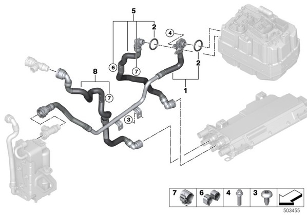 Запчасти из Германии / Запчасти БМВ / Запчасти G01 / X3 30eX B48X / Группы запчастей / Группа 17 «Система охлаждения» / Контур охлажд.жидк.высоковол.аккум.блок Контур охлажд.жидк.высоковол.аккум.блок для БМВ G01, модель X3 30eX B48X № Наименование Дополнение Кол-во Вып. с Вып. до Номер AE