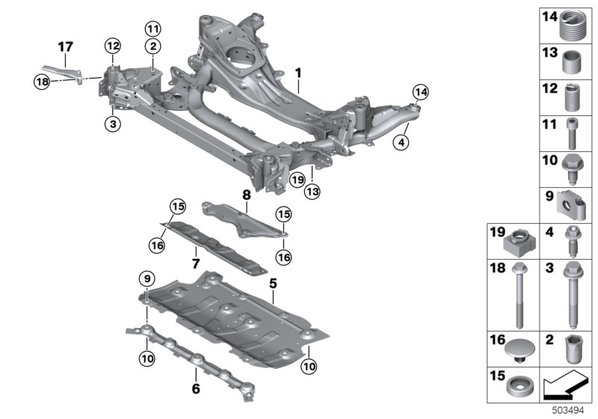 Запчасти из Германии / Запчасти БМВ / Запчасти G28 / 325LiX / Группы запчастей / Группа 31 «Передний мост» / Балка переднего моста, полноприводный Балка переднего моста, полноприводный для БМВ G28, модель 325LiX Комплектация Код Да Нет ? Исполнение для Китая L8AAA № Наименование Дополнение Кол-во Вып. с Вып. до Номер AE 01 балка переднего моста AWD 1 31106883293 02 Шайба глухой заклепки с плоской головкой M8 4 07147132312 03 Болт с неспадающ.стопорным элементом ASA M12X1,5X90 4 07146885922 04 Болт с шестигранной головкой с шайбой M14X42X1,5 2 07146886209 05 Панель жесткости 1 31106878580 06 Фиксатор противоподкатный брус впереди 1 31146884361 07 Гаситель колебан.д.панели жестк.впереди 1 31106885881 08 Гаситель колеб.д.панели жесткости сзади 1 31106885882 09 Гайка с пружинным зажимом M10-10 ZNS3 3 07146887266 10 Болт с неспадающ.стопорным элементом ASA M10X25 ZNS3 9 07146885805 11 Болт с шестигранной головкой M8X25-10.9 4 07119907484 12 Резьбовая вставка из проволочной спирали M12X1,5X30 4 33306780501 13 Резьбовая вставка M10X10 9 07129909277 14 Резьбовая вставка M14X1.5X14 2 33326869611 15 Верхняя часть зажима 9 07146887194 16 Нижняя часть зажима 9 07146887195 Для автомобилей с Исполнение для Китая L8AAA = да 17 Аварийный рычаг Л 1 31126876991 Для автомобилей с Исполнение для Китая L8AAA = да 17 Аварийный рычаг П 1 31126876992 18 Болт с шестигранной головкой с фланцем M12X136,10.9 2 31106885777 19 Гайка в держателе M12X1,5-10 ZNS3 2 31106874585