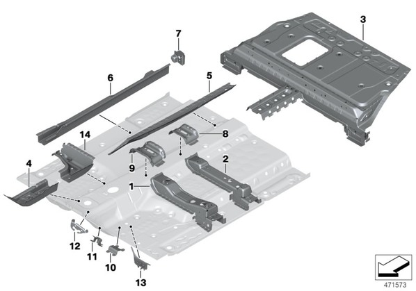 Запчасти из Германии / Запчасти БМВ / Запчасти F49N / X1 30LeX / Группы запчастей / Группа 41 «Кузов» / Перегородка баг.отделение/детали днища Перегородка баг.отделение/детали днища для БМВ F49N, модель X1 30LeX № Наименование Дополнение Кол-во Вып. с Вып. до Номер AE 01 Консоль сиденья Л Пд PHEV 1 41007402173 01 Консоль сиденья П Пд PHEV 1 41007402174 02 Консоль сиденья Л Зд PHEV 1 41007402193 02 Консоль сиденья П Зд PHEV 1 41007402194 03 Панель днища Зд PHEV 1 41007402284 04 Консоль соединения с осью Л Внутр PHEV 1 41007464615 04 Консоль соединения с осью П Внутр PHEV 1 41007464616 05 Консоль опорной балки КПП Л PHEV 1 41007464617 05 Консоль опорной балки КПП П PHEV 1 41007464618 06 Удлинит.переднего лонжерона сзади слева PHEV 1 41007454933 06 Удлинитель передн.лонжерона прав.задний PHEV 1 41007454934 07 Замыкающий щиток переднего лонжерона Л PHEV 1 41007464611 07 Замыкающий щиток переднего лонжерона П PHEV 1 41007464612 08 Элемент усиления туннеля Зд PHEV 1 41007464608 09 Элемент усиления туннеля Пд PHEV 1 41007464613 10 Держатель модуля педали акселератора Нж 1 41127391038 11 Держатель модуля педали акселератора Вх 1 41127391037 12 Держатель тросика привода переключения 1 41007386590 13 Фасонная деталь консоли соед.с осью 1 41117301901 14 Угловой кронштейн левый PHEV 1 41007464609 14 Угловой кронштейн правый PHEV 1 41007464610