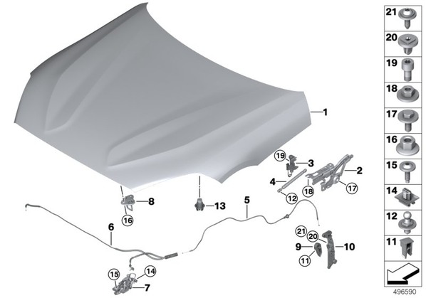 Запчасти из Германии / Запчасти БМВ / Запчасти G29 / Z4 20i B46D / Группы запчастей / Группа 41 «Кузов» / Крышка капота / навесное оборудование Крышка капота / навесное оборудование для БМВ G29, модель Z4 20i B46D Комплектация Код Да Нет ? Активная защита пешеходов S8TFA № Наименование Дополнение Кол-во Вып. с Вып. до Номер AE 01 Капот алюминий 1 41008495959 02 Петля капота Л 1 41008495965 02 Петля капота П 1 41008495966 Для автомобилей с Активная защита пешеходов S8TFA = да 03 Исполнительный механизм Л 1 51237435545 Для автомобилей с Активная защита пешеходов S8TFA = да 03 Исполнительный механизм П 1 51237435546 04 Газонап.амортизатор пассивного капота 2 51237435543 05 Трос привода замка капота 1 51237435522 06 Муфта комбинированного троса привода 1 51237435523 07 Замок левый 1 51237347404 07 Замок правый 1 51237347409 Для автомобилей с Активная защита пешеходов S8TFA = да 07 Замок левый FGS 1 51237347410 Для автомобилей с Активная защита пешеходов S8TFA = да 07 Замок правый FGS 1 51237347411 08 Верхняя часть замка 2 51237347412 09 Рычаг привода капота LL 1 51237943204 10 Комбинированный держатель LL 1 51237446416 11 Зажим SCHWARZ 1 51237441556 12 Шаровой палец M8X15 2 51249804726 13 Регулятор 2 51767183752 14 Кронштейн разъема 3 61139285769 15 Винт с плоск.гол.с прокладочной шайбой ISA M6X21 4 07147263759 16 Гайка шестигранная самоконтрящаяся M6 4 07149166256 17 Болт с шестигранной головкой с шайбой M8X25 4 07149231837 18 Гайка шестигранная с шайбой M8 4 07146959644 19 Винт ISA M6X12-8.8-ZNNIV 2 07129905867 20 Распорная гайка 7X7 MM 2 65138387414 21 Самонарезающий винт 4,8X16 2 07119907237