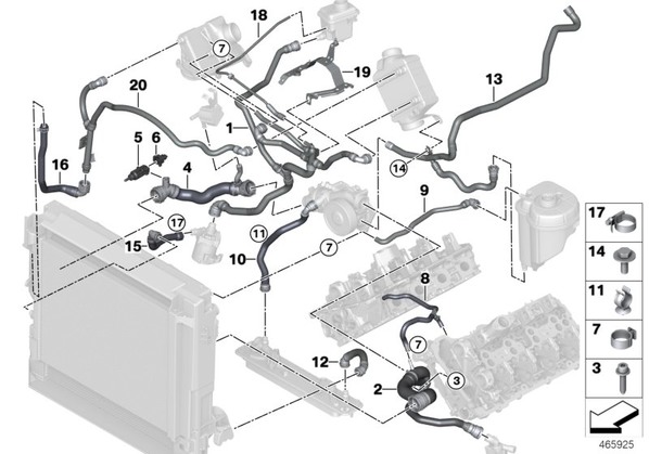 Запчасти из Германии / Запчасти БМВ / Запчасти F16 / X6 50iX / Группы запчастей / Группа 17 «Система охлаждения» / Водяной шланг системы охлаждения Водяной шланг системы охлаждения для БМВ F16, модель X6 50iX № Наименование Дополнение Кол-во Вып. с Вып. до Номер AE 01 Трубопровод расширительный бачок 1 17127634257 02 Шланг системы охлаждения 1 17127576354 03 Болт с цилиндрической головкой 1 07149166130 04 Шланг системы охлаждения 1 17127576358 05 Датчик температуры охлаждающей жидкости 1 13621433077 06 Корпус розетки 2 POL. 1 12521427615 только в комбинации с -- Гнездовой контакт SLK 2,8 ELA 0,22-0,35MM² AG 1 12521427612 07 хомут 13,2-15,7 3 34321156893 08 Вентиляционный трубопровод двигателя 1 17127619702 09 Шланг расш.бачок- 1 17128627119 10 Шланг системы охлаждения 1 17127576370 11 Держатель шланга 1 11727511099 12 Шланг системы охлаждения 1 17127576367 13 Трубопровод обогрев-расш.бачок-насос 1 17127648187 14 Болт с шестигранной головкой с шайбой M6X18-U2-ZNS3 2 07119902933 15 Шланг системы охлаждения 1 17127589632 16 Шланг системы охлаждения радиатор 1 17127576280 17 хомут L16-28 1 17127587359 18 Трубопровод расширительный бачок 1 17127634265 19 Многофункциональный держатель 1 17137634269