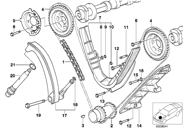 Запчасти из Германии / Запчасти БМВ / Запчасти E39 / 535i / Группы запчастей / Группа 11 «Двигатель» / Приводная цепь механ.газораспред. Нж Приводная цепь механ.газораспред. Нж для БМВ E39, модель 535i № Наименование Дополнение Кол-во Вып. с Вып. до Номер AE 01 Приводная цепь 1 09.1998 11311741746 02 Звездочка 1 09.1998 11211742435 03 Сегментная шпонка 5X6,5 2 09.1998 07119951480 04 Звездочка 2 09.1998 11311742059 05 Колесо импульсного датчика 1 09.1998 11311742139 06 Винт Torx M6X35 X 09.1998 11311742140 07 Обводная планка цепи 1 09.1998 11311741777 08 Дроссельная шайба 1 09.1998 11311742468 09 Кольцо круглого сечения 11,2X1,8 1 09.1998 07119906363 10 Уплотнительное кольцо 8,1X3,5X7,7 1 09.1998 11141736758 11 Установочный винт 1 09.1998 11151736960 12 Винт Torx M7X28 4 09.1998 11311741808 13 Винт Torx M6X25 3 09.1998 11311731952 14 Направляющая 1 09.1998 11311704945 15 Болт с шестигранной головкой M6X28-8.8-ZNS 1 09.1998 07119913021 16 Прокладочная шайба A6,4-ZNNIV SI 1 09.1998 07119904202 17 Планка натяжителя 1 09.1998 11311741236 18 Кольцо круглого сечения 6,0X2,5 1 09.1998 11421713597 19 Винт Torx M10X60 1 09.1998 11311741254 20 Натяжитель цепи 1 09.1998 11317531813 21 Уплотнительное кольцо A22X27-AL 1 09.1998 07119963355