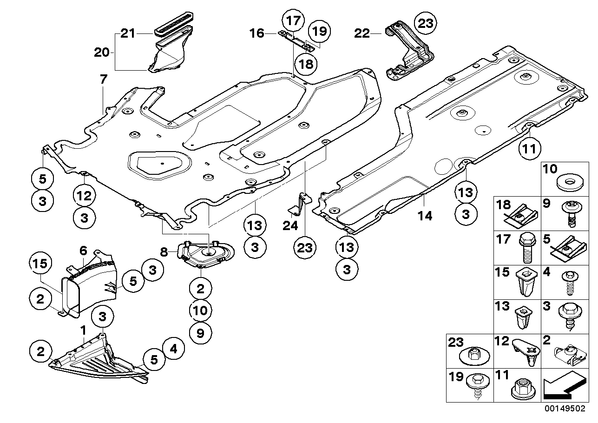 Запчасти из Германии / Запчасти БМВ / Запчасти E64 / M6 / Группы запчастей / Группа 51 «Оснащение кузова» / Экран моторного отсека/облицовка днища Экран моторного отсека/облицовка днища для БМВ E64, модель M6 № Наименование Дополнение Кол-во Вып. с Вып. до Номер AE 05 Гайка с пружинным зажимом C самоконтр. ST 4.8 -ZNS3 8 07147154447 07 Облицовка днища кузова Ср 1 51757897864 09 Винт быстроразъемного соединения 15,4MM 1 51717110995 10 Шайба фиксирующая D=12MM 1 51718212163 11 Пластмассовая гайка с шайбой D=18MM 8 51161943122 12 Распорная гайка ST 4.8 2 07147130337 13 Распорная гайка ST4,8MM 6 51717154520 14 Облицовка днища кузова Л 1 51757009725 14 Облицовка днища П 1 51757009726 15 Распорная гайка ST 4.8 WEISS 2 63171367868 16 Кронштейн облицовки днища Ср 1 51757898305 17 Болт с шестигранной головкой с шайбой M10X25-10.9ZNS3 2 07119905147 18 Гайка с пружинным зажимом C самоконтр. ST 4.8 -ZNS3 2 07147154447 19 Саморез с шестигранной головкой с шайбой ST4,8X16MM 2 07147129160 20 Воздуховод масляного фильтра КПП 1 51757906479 21 Уплотнитель воздуховода 1 51758040148 22 Кронштейн облицовки днища Л 1 51717152821 22 Кронштейн облицовки днища П 1 51717152822 23 Листовая гайка D=18MM, ZNS-3 4 07146949379