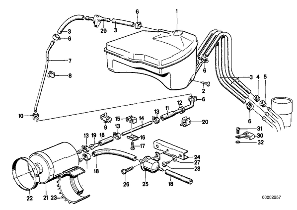 Запчасти из Германии / Запчасти БМВ / Запчасти E28 / 533i / Группы запчастей / Группа 16 «Система подачи топлива» / Расширительный бачок/фильтр с акт.углем Расширительный бачок/фильтр с акт.углем для БМВ E28, модель 533i № Наименование Дополнение Кол-во Вып. с Вып. до Номер AE 01 Расширительный бачок 1 10.1984 16131152375 02 Саморез с шестигранной головкой ST6,3X19-C-Z2 1 07119916967 03 Топливный шланг 6X11MM X 13311272750 04 наконечник 3 16131152490 05 наконечник 3 16121119376 06 хомут L=9-12 9 07129952102 07 Воздухоотводная труба 1 16131152524 08 Клемма D=6MM 1 63121364431 09 Хомут 2 16131152489 10 наконечник 2 16124780109 11 Шланг 1 16131152517 E 12 Резиновая втулка 2 34321118503 E 13 хомут L12-15 5 07129952104 14 Трубка L=2574MM 1 16131152903 E 15 Зажим 9 16121107928 16 Кронштейн 9 16121155060 17 Самонарезающий винт 9 34321119239 18 Топливный шланг 8X13MM X 06.1996 13311722262 E 18 Топливный шланг 8X13MM X 16121180409 19 Переходник 1 16120480125 20 Кронштейн вентиляционной трубы 2 16131177583 21 фильтр с активированным углем 1 03.1987 16121108926 E 21 фильтр с активированным углем 1 03.1987 16121108967 E 22 хомут L89-96 1 07129952135 24 Кронштейн 1 12.1983 12521279574 E 25 Клапан вентиляции топливного бака 1 12.1983 11741277566 E 26 Самонарезающий винт 2 12.1983 34321119239 27 шайба 2 12.1983 07119904207 28 Самонарезающий винт ST4,8X9,5-C-H-Z 2 12.1983 07119901200