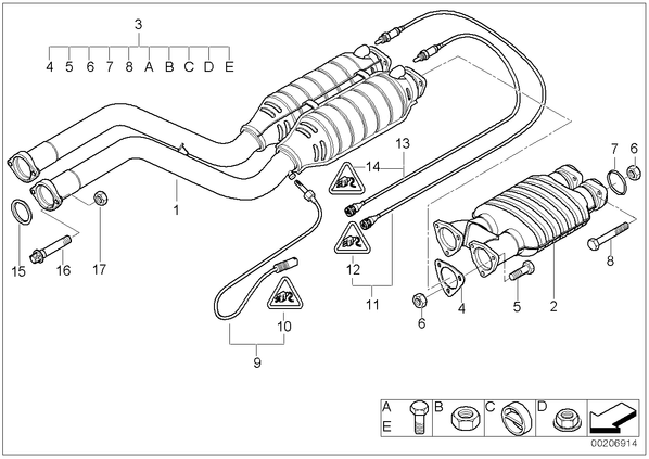 Запчасти из Германии / Запчасти БМВ / Запчасти Z3 / Z3 M3.2 S54 / Группы запчастей / Группа 18 «Система выпуска ОГ» / Катализатор/лямбда-зонд Катализатор/лямбда-зонд для БМВ Z3, модель Z3 M3.2 S54 № Наименование Дополнение Кол-во Вып. с Вып. до Номер AE 01 Оборотная приемная труба катализатора 1 18307832489 02 Средний глушитель 1 18107831421 03 К-т дополнительных элементов глушителя 1 18210151442 04 Плоск. уплотн.прокладка 2 18307830674 Необх. для ремонта -- Гайка шестигранная M8 SW12 6 11621744323 -- Болт с шестигранной головкой M8X30-8.8-ZNS3 6 07119902901 05 Болт с шестигранной головкой M8X30-8.8-ZNS3 6 07119902901 06 Гайка шестигранная M8 SW12 10 11621744323 07 Уплотнительное кольцо 2 18111723379 08 Болт с шестигранной головкой M8X55-8.8 4 07119902957 09 ґРвзШЪ вХЬЯХаРвгал ѕі 1 11787831624 11 Лямбда-зонд BOSCH/L=750MM 1 11781405324 Разъем жгута проводов 12 Корпус вилки разъема 4 POL. 1 12521703570 только в комбинации с -- цилиндрический разъем 0,5- 1,0 MM² X 61130007657 Разъем жгута проводов -- Изоляция отдельных проводников 0,75-1,0MM² X 12521748973 подходит только к лямбда-зонду 12 Корпус вилки разъема 4 POL. 1 12521703571 только в комбинации с -- цилиндрический разъем 0,5- 1,0 MM² X 61130007656 подходит только к лямбда-зонду -- Изоляция отдельных проводников 0,75-1,0MM² X 12521748973 13 Лямбда-зонд L=450MM 1 11781743996 15 Уплотнительное кольцо 2 11627830668 Необх. для ремонта -- Гайка шестигранная M10 4 18301317898 -- Винт Torx M10X45 4 11621318568 16 Винт Torx M10X45 4 11621318568 17 Гайка шестигранная M10 4 18301317898