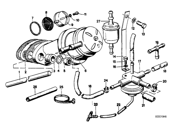 Запчасти из Германии / Запчасти БМВ / Запчасти E12 / 518 / Группы запчастей / Группа 13 «Подготовка и регулир. рабочей смеси» / Система подачи топлива/насос/фильтр Система подачи топлива/насос/фильтр для БМВ E12, модель 518 № Наименование Дополнение Кол-во Вып. с Вып. до Номер AE 01 Шток насоса 1 13311255727 02 Изолирующий фланец AF 1 11111721614 03 Изолирующая втулка 2 13310075752 04 Упругая шайба B8 2 06.1981 07119932095 AE 04 Упругая шайба 2 07119904115 05 Гайка шестигранная с фланцем M8 2 11611713432 AE 06 Топливный насос 1 09.1980 13311265193 07 Уплотнительное кольцо APG 1 09.1980 13311260982 E 07 уплотнительная прокладка F&S 1 09.1980 13319057875 E 08 Топливный фильтр APG 1 09.1980 13311260979 E 09 Колпачок APG 1 09.1980 13311260978 E 10 Уплотнительное кольцо 1 09.1980 13311260981 E 11 Болт с цилиндрической головкой 1 09.1980 13311260980 E 12 Упругая шайба B6 1 07119932099 12 Упругая шайба B6-ZNS3 1 07119904496 E 13 Болт с шестигранной головкой M6X12 1 07119913442 AE 13 Болт с шестигранной головкой M6X12-8.8-ZNNIV 1 07119905524 14 Кронштейн 1 13311261553 E 17 Клапан 1 13311259194 18 Топливный шланг 6X11MM X 13311272750 19 Дроссельное сопло 1 13311265430 21 Топливный шланг 8X13MM X 06.1996 13311722262 E 21 Топливный шланг 8X13MM X 16121180409 23 T-образный элемент 1 11731261489 24 хомут L10-12 4 01.1979 16111177646 AE 24 хомут L=9-12 4 07129952102 27 Топливный фильтр 6+8 MM 1 13321277497 27 Топливный фильтр 8 MM 1 13321278272 E