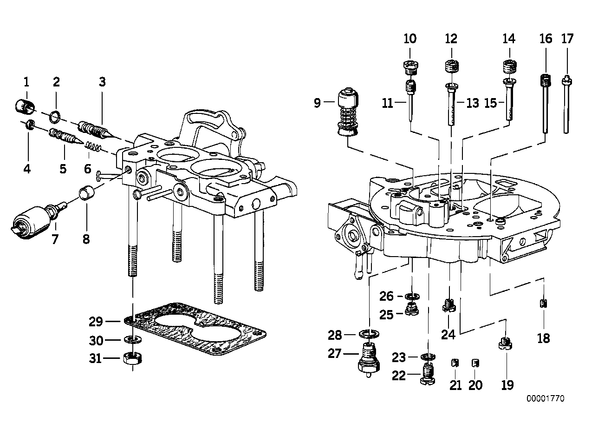 Запчасти из Германии / Запчасти БМВ / Запчасти E12 / 528 / Группы запчастей / Группа 13 «Подготовка и регулир. рабочей смеси» / Корректировки состава смеси Корректировки состава смеси для БМВ E12, модель 528 № Наименование Дополнение Кол-во Вып. с Вып. до Номер AE 01 Колпачок BLAU 4 08.1976 13111265510 02 Кольцо круглого сечения 12,4X9,0X1,7 2 08.1976 13111286431 E 04 Винт корректировки состава смеси 2 13111278354 05 Винт корректировки состава смеси 2 08.1975 13111255990 05 Винт корректировки состава смеси 2 07.1976 13111278354 06 Пружина сжатия 2 08.1975 13110539210 E 06 Пружина сжатия 2 08.1975 13111250707 E 07 Клапан уменьш.подачи топлива на хол.х. 2 08.1976 13111260218 E 07 Клапан уменьш.подачи топлива на хол.х. 50 2 08.1976 13111260516 08 Уплотнительное кольцо 2 08.1976 13111707010 09 Поршень насоса 2 08.1976 13111285451 10 Форсунка подачи воздуха на холостом ходу 125 2 08.1976 13111260758 E 11 Форсунка холостого хода 45 2 08.1975 13111253063 E 12 Воздушный жиклер гл.дозир.сист. I ступ. 80 2 08.1975 13111253057 E 13 Смесительный патрубок ступень 1 6S 2 08.1975 13111253062 E 14 Воздушный жиклер гл.дозир.сист. II ступ 100 2 08.1975 13111253058 E 15 Смесительный патрубок ступень 2 4N 2 08.1976 13111253061 E 16 Воздушный жиклер пускового устройства 50 1 08.1976 13111263697 E 19 основная форсунка ступень II 140 2 08.1975 13110639129 E 20 Эмульсионный жиклер эконостата 40 2 08.1975 13111260597 E карбюратор Пд 21 Сопло 52,5 1 08.1976 13111263709 E 22 Нагнетательный клапан насоса 2 08.1976 13111253068 E 23 Уплотнительное кольцо 2 08.1976 13111253922 E 24 Основная форсунка 115 2 08.1975 13111253056 E 25 Впускной клапан насоса 2 08.1976 13111253066 26 Уплотнительное кольцо 2 08.1976 13111253921 E 27 Игольчатый клапан поплавковой камеры 2 08.1976 13111271963 28 Уплотнительное кольцо 2 08.1976 13110539245 29 уплотнительная прокладка 2 08.1976 13111263266 30 Упругая шайба B8 8 08.1976 07119932095 AE 30 Упругая шайба 8 08.1976 07119904115 31 Гайка шестигранная M8-ZNS 8 07119922856 E 31 Гайка шестигранная M8-8-ZNS3 8 09.1977 07119904032 31 Гайка шестигранная M8-8-ZNNIV SI 8 07119905515