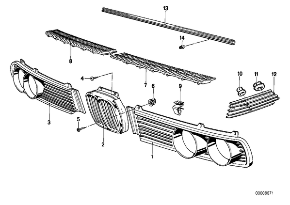 Запчасти из Германии / Запчасти БМВ / Запчасти E12 / 528i / Группы запчастей / Группа 51 «Оснащение кузова» / Декоративная решетка Декоративная решетка для БМВ E12, модель 528i № Наименование Дополнение Кол-во Вып. с Вып. до Номер AE 01 декоративная решетка Л 1 09.1976 51131848237 E 02 декоративная решетка Ср 1 09.1976 51131848104 03 Декоративная решетка П 1 09.1976 51131848238 E 04 Винт самонарезающий со сферич.головкой ST3,9X19 2 09.1976 07119906744 05 Винт самонарезающий со сферич.головкой ST3,9X13 X 09.1976 07.1981 51131823634 AE 05 Винт самонарезающий со сферич.головкой ST3,9X13 X 09.1976 07147202502 06 Распорная гайка 3,9 X 09.1976 51135680113 07 Декоративная решетка возд.впуск.сопла Л 1 09.1976 51131848125 08 Декоративная решетка возд.впуск.сопла П 1 09.1976 51131848126 09 Скоба 5 09.1976 51131819327 10 наконечник 4 09.1976 51141807495 10 наконечник 4 09.1976 51141852899 11 Кнопка 2 09.1976 51131820141 12 Накладка воздушного сопла Л Зд SCHWARZ 1 09.1976 51131817611 12 Накладка воздушного сопла П Зд SCHWARZ 1 09.1976 51131817612 E 12 Накладка воздушного сопла Л Зд CHROM 1 09.1976 51131848291 E 12 Накладка воздушного сопла П Зд CHROM 1 09.1976 51131848292 E 13 Декоративная планка задней панели кузова 1 09.1976 51131866706 E 13 Декоративная планка задней панели кузова 1 09.1976 51131871626 E 14 Скоба 1 09.1976 51131858761